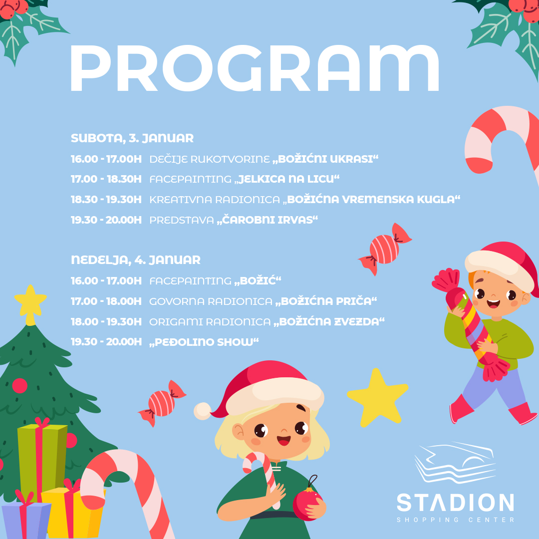 Prvi januarski vikend u šoping centru Stadion protiče u znaku praznične topline i čarolije pod nazivom „Božićna priča“. Najmlađe posetioce, ali i celu porodicu, očekuje bogat program ispunjen kreativnim, zabavnim i edukativnim sadržajima koji neguju maštu, zajedništvo i božićni duh.