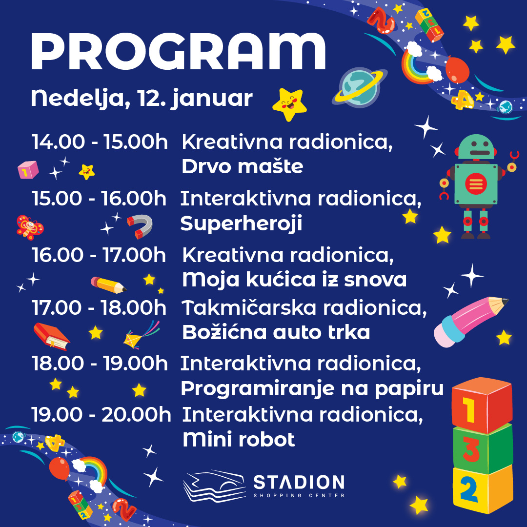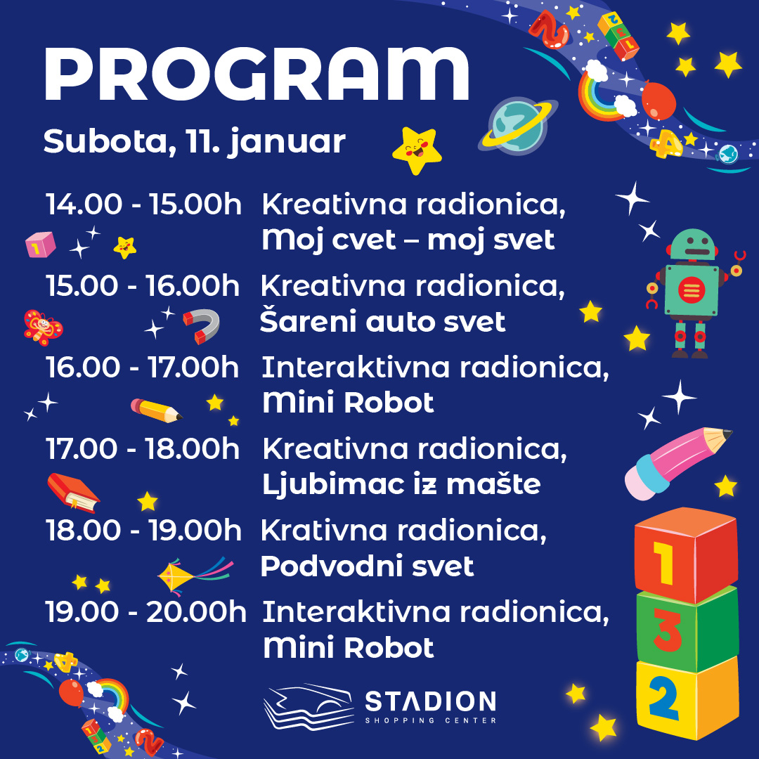 Tokom vikenda 11. i 12. januara očekuje vas dinamičan i zabavan program! Započinjemo radionicom koja donosi mnogo boja i kreativnosti, Moj cvet – moj svet. Uz pomoć mašte, svaki cvet će postati unikatno umetničko delo – sa šarenim laticama, šljokicama, perlicama i razigranim detaljima. Deca će se zabaviti osmišljavajući detalje poput šarenih točkova, svetlećih farova ili prozora sa nasmejanim licima uz Šareni auto svet. Imaćete priliku da kreirate i oživite svog Ljubimca iz mašte ili Podvodnog sveta. Motivisaćemo mališane na aktivno učešće kroz dijalog, razmenu ideja i praktične aktivnosti interaktivnom radionicom Mini Robot. Pored toga, podstaći ćemo maštu i inženjersko razmišljanje, naučićete kako da napravite svoje prve robote na baterije koristeći materijale svakodnevnice.