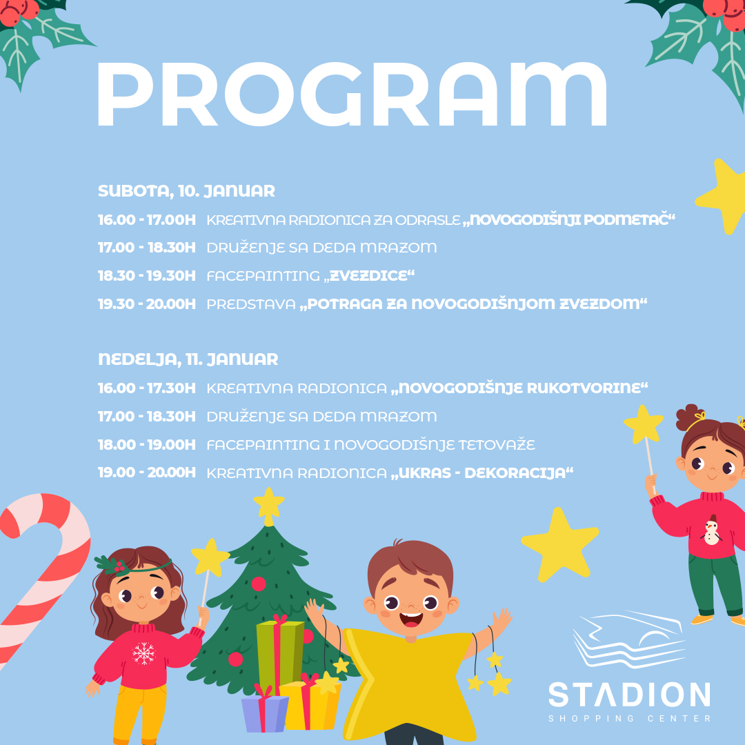 Šoping centar Stadion i drugog januarskog vikenda donosi prazničnu čaroliju kroz događaj „U potrazi za novogodišnjim zvezdicama“, namenjen najmlađima i celoj porodici. Posetioce očekuje bogat program ispunjen kreativnim, zabavnim i edukativnim sadržajima koji neguju maštu, zajedništvo i praznični duh.