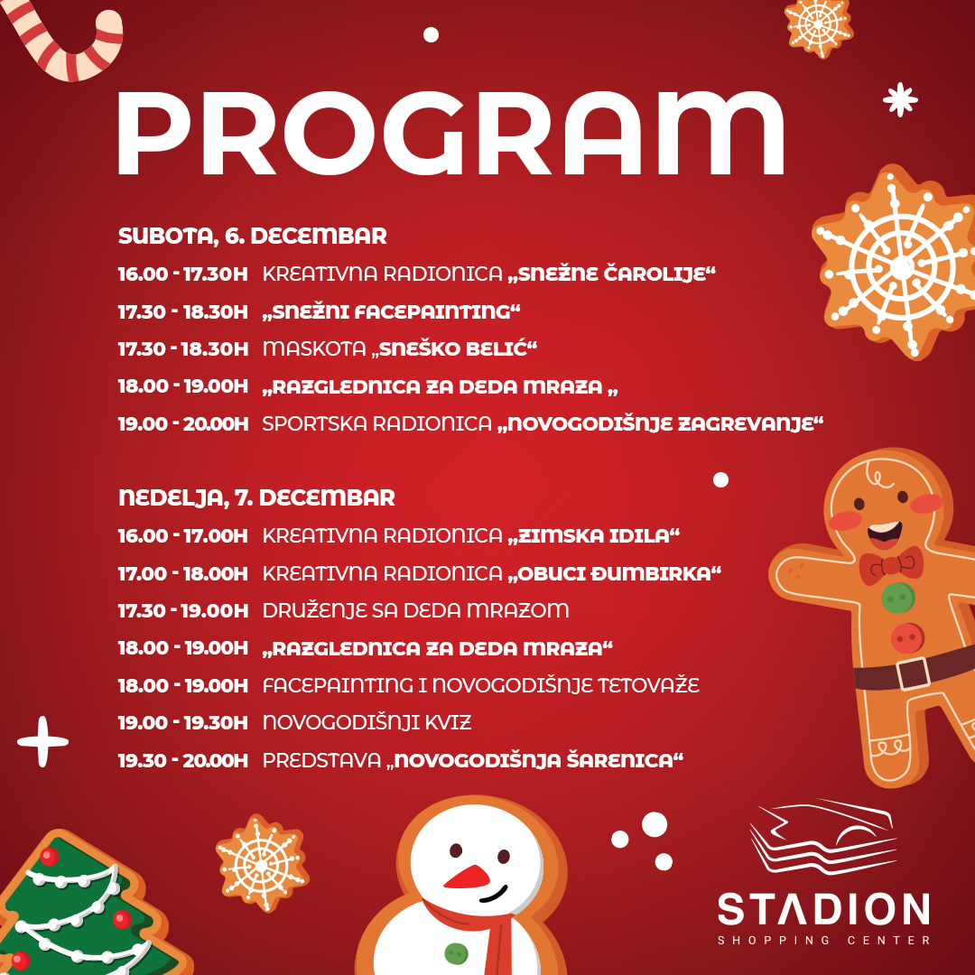 Stadion šoping centar pripremio je četiri čarobna decembarska vikenda ispunjena maštovitim kreativnim radionicama, pisanjem želja Deda Mrazu, subotnjim druženjima sa maskotama i  nedeljnom avanturom  sa Deda Mrazom, kao i omiljenim novogodišnjim predstavama.