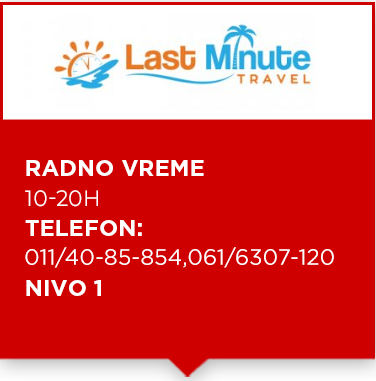 Turistička agencija LAST MINUTE TRAVEL je osnovana posle višegodišnjeg iskustva i rada u turizmu vlasnika agencije i spada u posredničke turističke agencije. Na jednom mestu možete pronaći veliki broj programa po istim cenama i uslovima kao i kod organizatora. U našoj ponudi nalaze se aranžmani za putovanja po Evropi i svetu, evropske metropole, ponude za letovanje, zimovanje, doček Nove godine u zemlji i inostranstvu, daleke I egzoticne destinacije, krstarenja, avio karte, putno osiguranje… Najvažnije nam je da nadjemo pravo putovanje baš za Vas. Na Vama je samo da izaberete šta želite, a mi ćemo se potruditi da vam obezbedimo putovanje koje ćete godinama pamtiti I prepričavati…