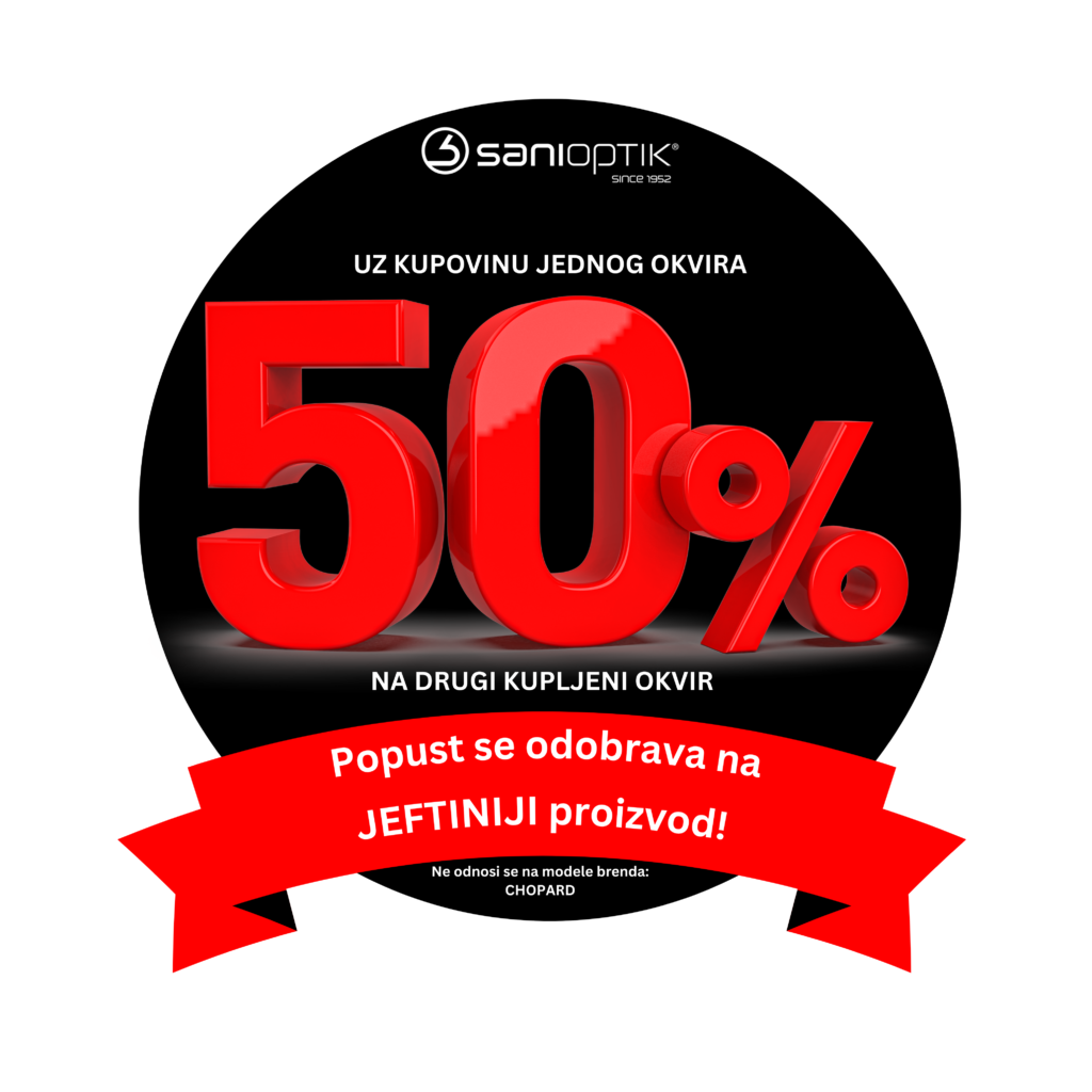 Kupite jedan okvir, a na drugi ostvarite 50% popusta!Popust se odnosi na jeftiniji okvir, a važi samo do kraja ovog meseca!