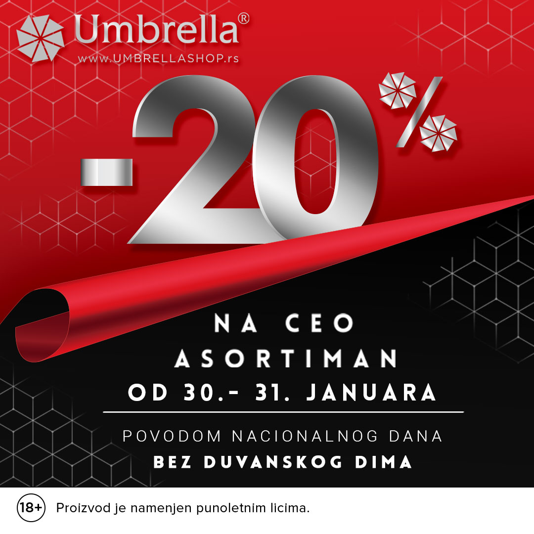 Povodom Nacionalnog dana bez duvanskog dima u Umbrella šopu važi ponuda -20% na kompletan asortiman proizvoda i to u periodu od 30. – 31. januara.
