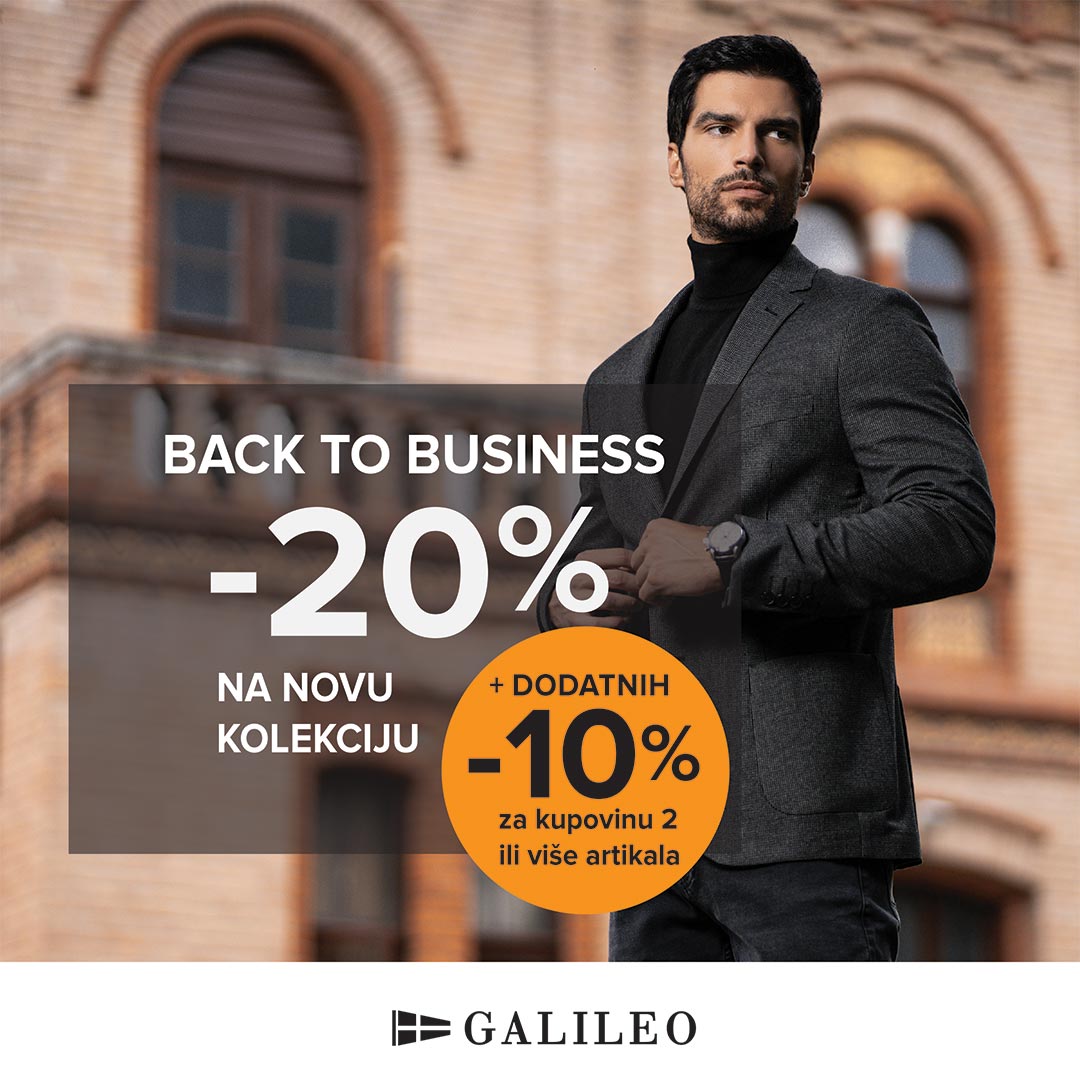BACK TO BUSINESS – Nakon godišnjih odmora vreme je za povratak na posao sa stilom! Upravo zato u Galileo prodavnici čeka te akcija BACK TO BUSINESS uz koju ostvaruješ -20% POPUSTA pri kupovini odeće iz nove kolekcije. Za kupovinu 2 ili više artikala dajemo ti dodatnih -10% popusta. Izaberi novo odelo, sako, košulju ili bilo što što trebaš za izvrstan poslovni look i uživaj u kupovini s uštedom!