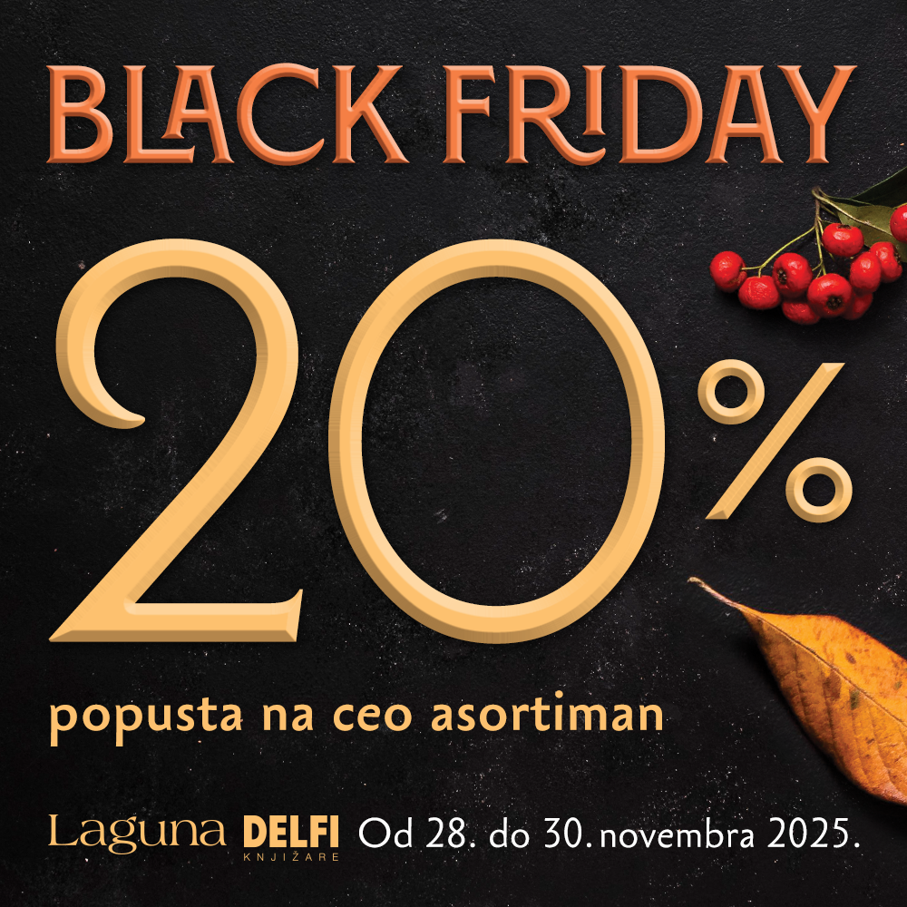 Od 28. do 30. novembra 2025. „Black Friday“ obeležićemo sniženjem od 20% na knjige u izdanju Lagune, celokupan gift program i naslove drugih domaćih, kao i stranih izdavača. Popust od 20% je fiksni. Količinski popust važi samo za kupovinu knjiga u izdanju Lagune. Ostali popusti i akcije ne važe. Popust se ne obračunava na ulaznice, poklon-kartice/vaučere, magazin Nedeljnik, IQOS uređaje, udžbenike, ploče, CD-ove, plastične i papirnate kese.