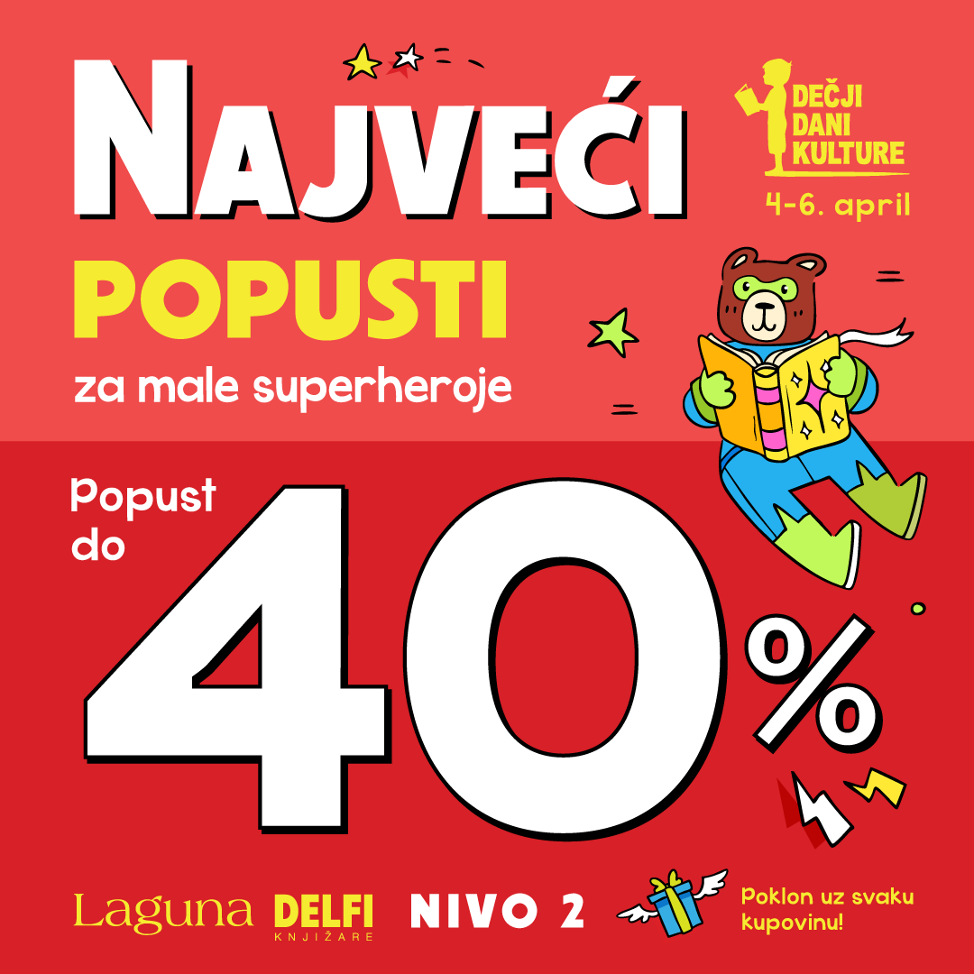 Popust na jednu Laguninu knjigu za decu iznosiće 25%, na dve 30%, na tri 35%, a na četiri ili više knjiga 40%.