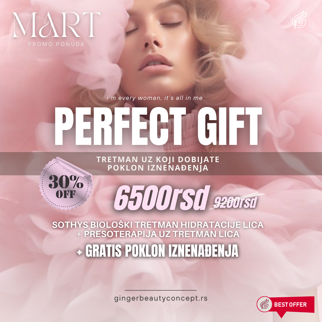 PERFECT GIFT – Jedan od omiljenih paketa iz ovomesecne ponude, protokol koji kombinuje tretmane za poletan osecaj i hidriran, odmoran i blistav izgled celog tela i lica, uz sjajan POKLON IZNENADENJA 🎁 koji dobijate na kraju tretmana od nas!