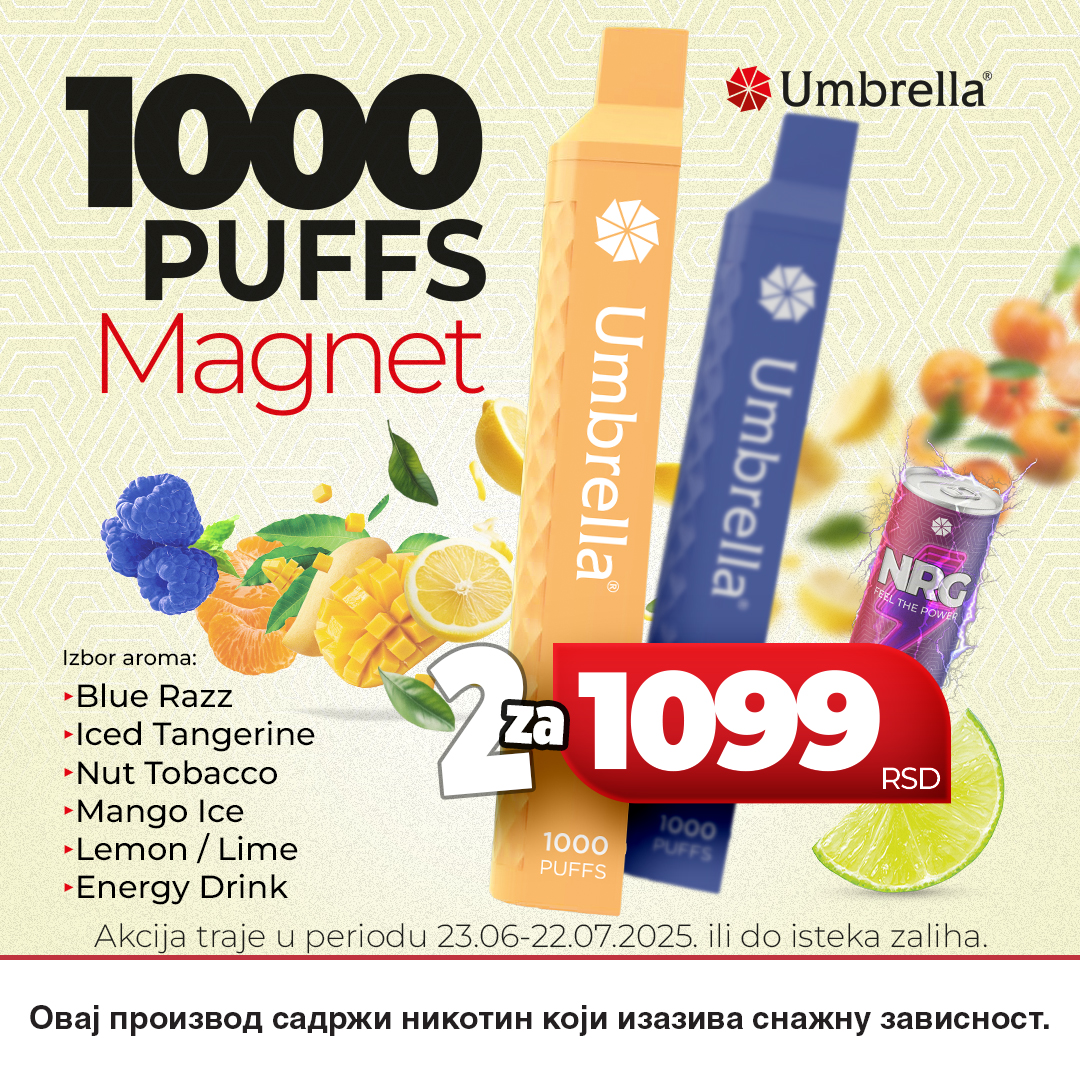 U Umbrella šopu trenutno je aktuelna ponuda dva modela 1000 PUFFS MAGNET po ceni od 1.099 dinara (STARA CENA: 1598 rsd).