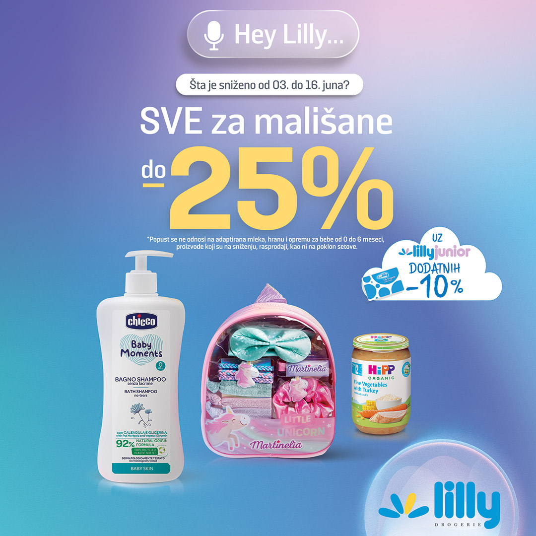 Popust na sve za mališane do 25%, a uz Lilly junior dodatnih 10% u periodu od 03.06-16.06.