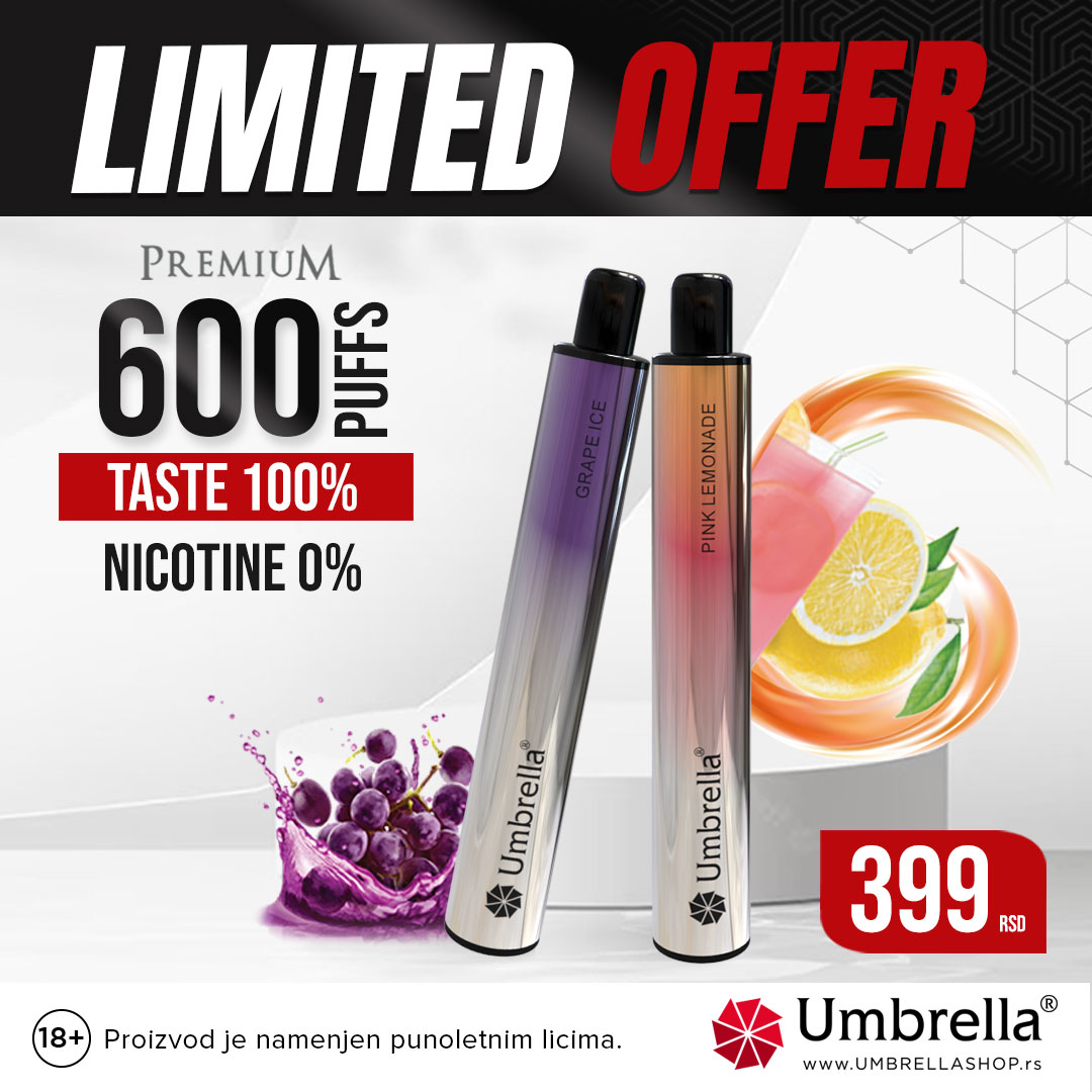 Umbrella 600 puffs bez nikotina po ceni od 399 rsd! Ovaj model ima 2 ml tečnosti, kao i gumirani nastavak za usta koji pruža komfor korisnicima.