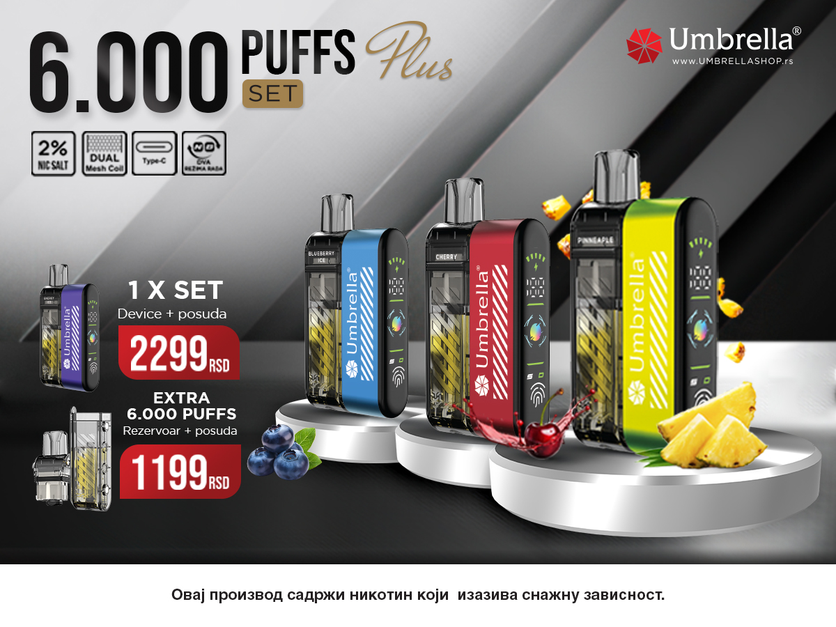 UMBRELLA 6000 PUFFS SET PLUS je komplet koji se sastoji od punjivog uređaja i zamenskog tanka sa grejačem kapaciteta 2ml sa posudom za ponovno punjenje kapaciteta 10ml! Ovaj set se može naći po ceni od 2.299 dinara.