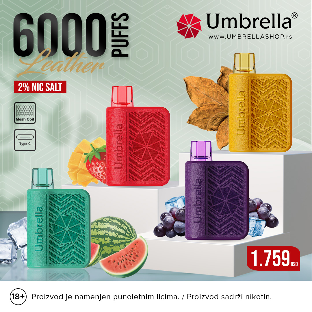UMBRELLA 6000 PUFFS LEATHER, jednokratni vejp sa punjivom baterijom možete naći na štandu kompanije Umbrella.