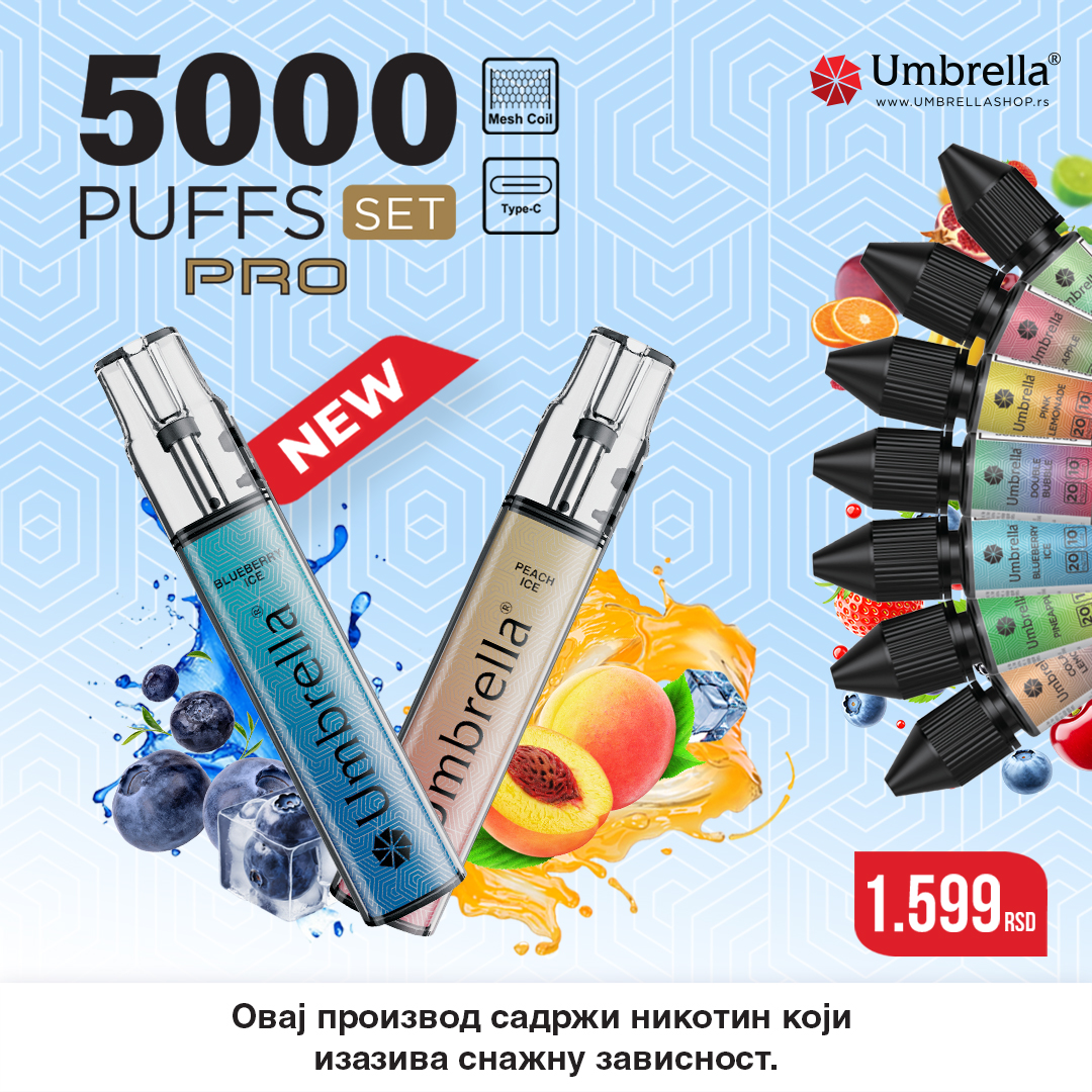 Premium Umbrella elektronska cigareta 5000 PUFFS Set PRO je komplet koji se sastoji od punjivog uređaja i posude (bočice) u kojoj se nalazi 10ml tečnosti.