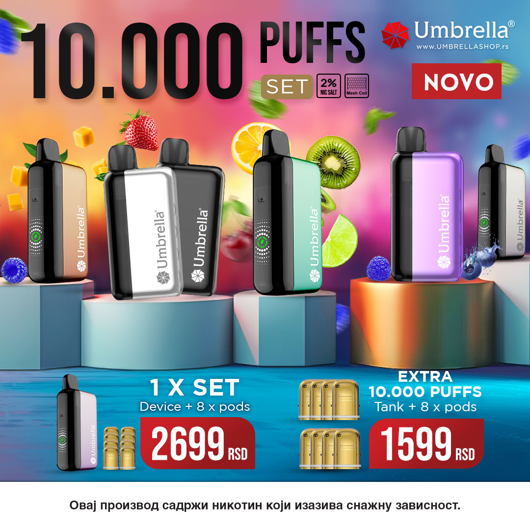 Premium Umbrella elektronska cigareta 10000 PUFFS SET je komplet koji se sastoji od punjivog uređaja, zamenskog tanka sa grejačem i 8 PODova kapaciteta od po 2ml!