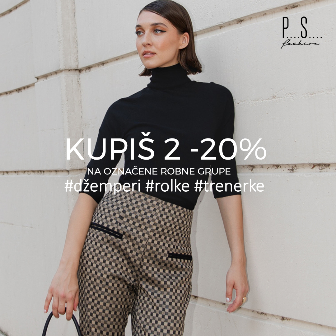 Za ljubitelje kvalitetnih odevnih komada pripremili smo 20% popusta na označene modele džempera, rolki, trenerki i majica iz kolekcije jesen zima.