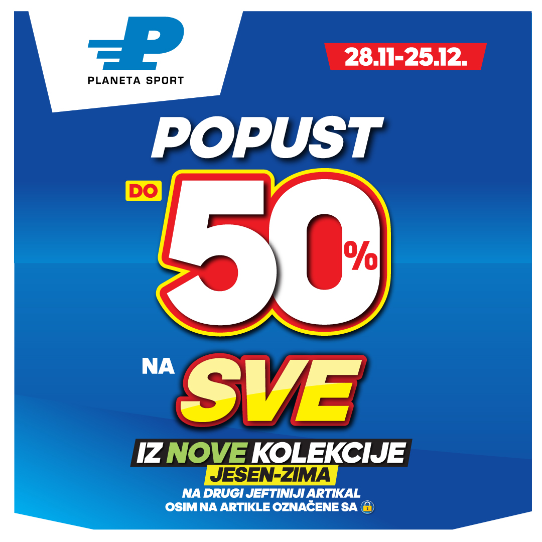 Hej, poseti Planeta Sport prodavnicu i iskoristi do 50% popusta na KOMPLETNU NOVU KOLEKCIJU JESEN/ZIMA, na drugi jeftiniji artikal.🔝