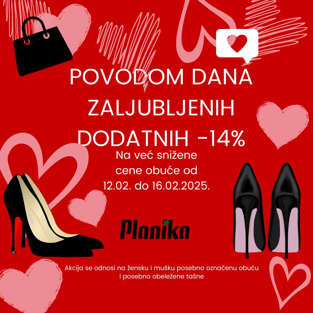 Povodom dana zaljubljenih odobrava se popust od -14% na već snižene cene, i odnosi se na modele ženske i muške obuće. Dečiji artikli se izuzimaju iz ove akcije.