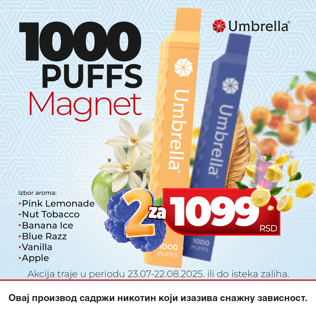 U Umbrella šopu trenutno je aktuelna ponuda dva modela 1000 PUFFS MAGNET po ceni od 1.099 dinara.