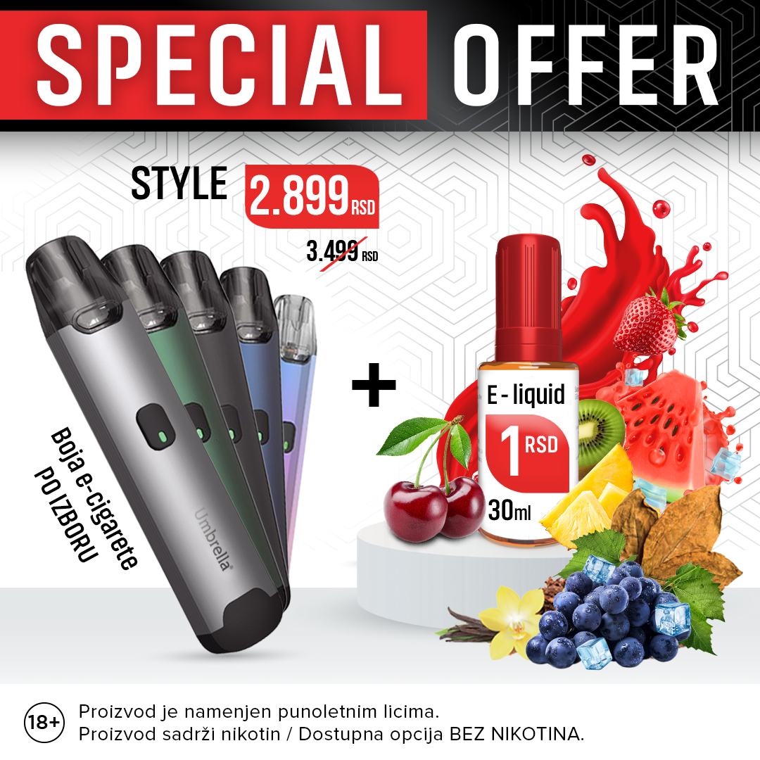 Uz kupovinu Umbrella STYLE modela po sniženoj ceni od 2.899 dinara, ostvarujete mogućnost za kupovinu tečnosti od 30ml po Vašem izboru!