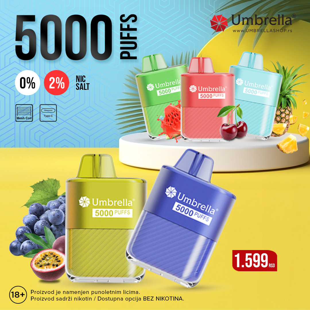 Jednokratni vape model UMBRELLA 5000 PUFFS dostupan je u 16 intenzivnih ukusa.