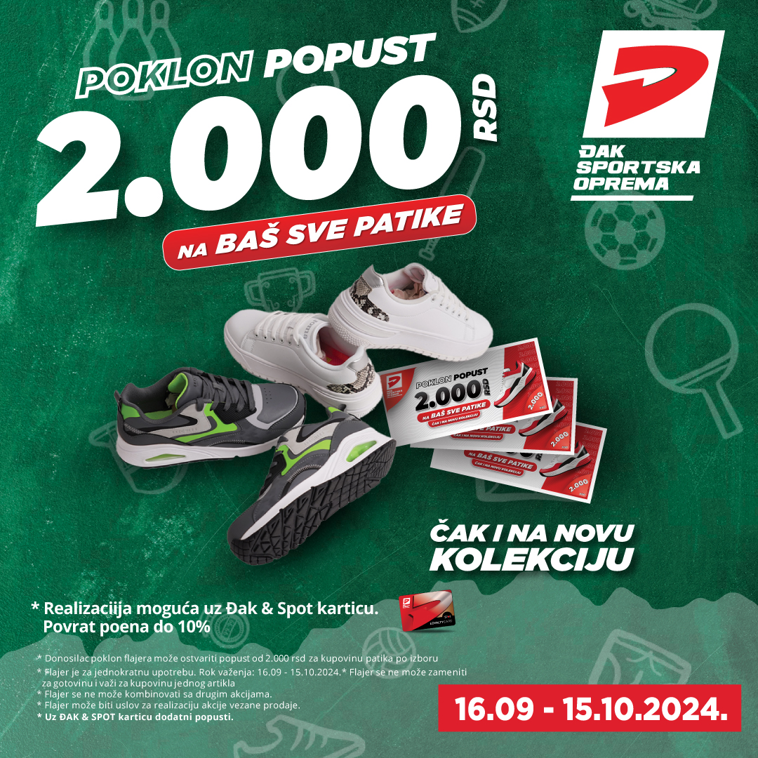 2000 dinara poklon popusta za kupovinu BAŠ SVIH PATIKA, KAO i NOVE KOLEKCIJE! Popust važi u ĐAK radnji, SC Stadion, nivo 0.