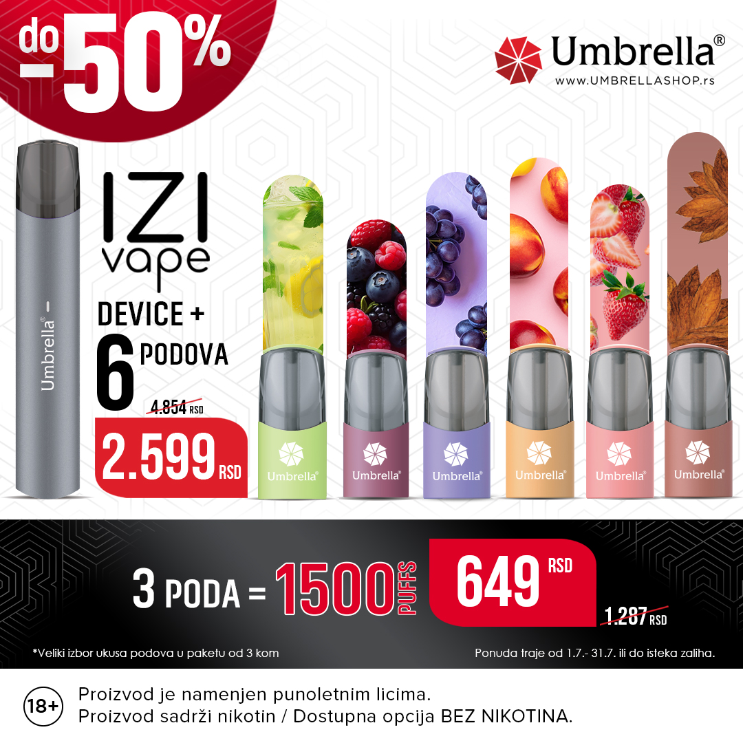 Dobro poznati uređaj, IZI VAPE se u okviru Umbrella šopa može naći po sniženoj ceni u paketu sa 6 podova za 2.599 rsd, umesto po staroj ceni od 4.854 rsd. Ujedno u Umbrella šopu važi ponuda za 3 poda, po ceni od 649 rsd (stara cena 1.287 rsd).