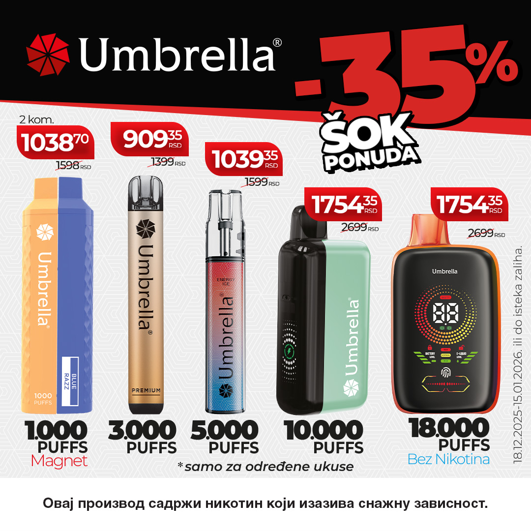 Posetite Umbrella šop i iskoristite šok ponudu od -35% na odabrane proizvode iz asortimana. U ponudu su uključeni jednokratni modeli, ali i punjivi, kao i nikotinske vrećice i e-tečnosti.