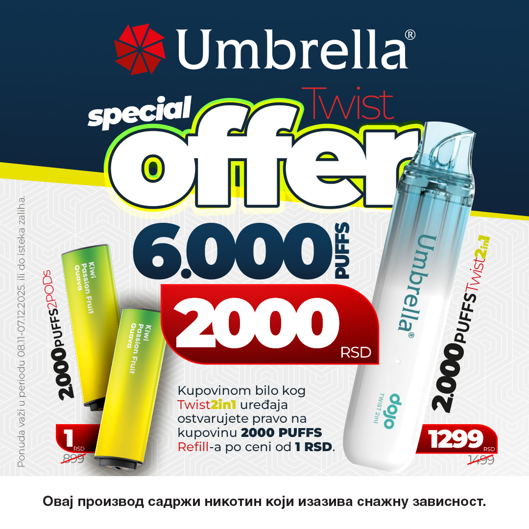 U Umbrella shopu u toku je specijalna ponuda za model 2000 PUFFS TWIST – uz svaki kupljeni kit dobija se pakovanje PODova (2 komada) za 1 RSD.