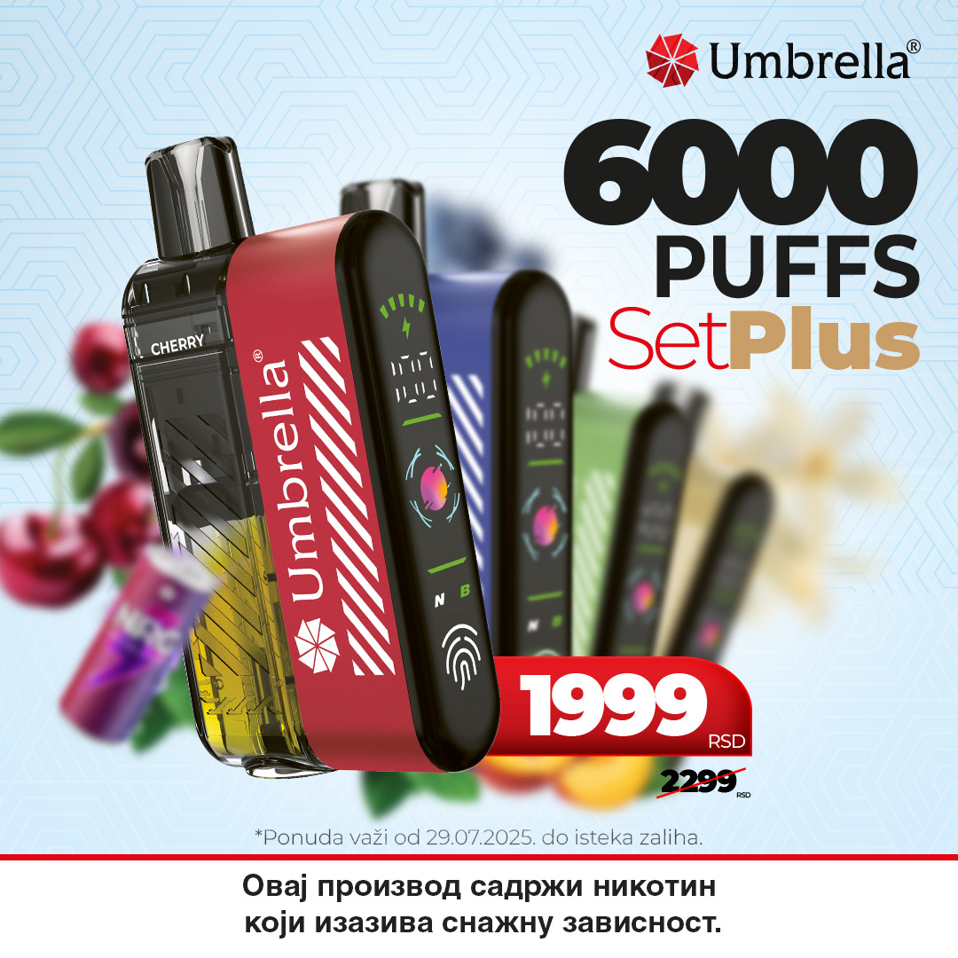 U Umbrella shopu je aktuelna ponuda za model 6000 PUFFS SET PLUS – 1.999 RSD umesto 2.299 RSD. Ova ponuda važi do isteka zaliha!