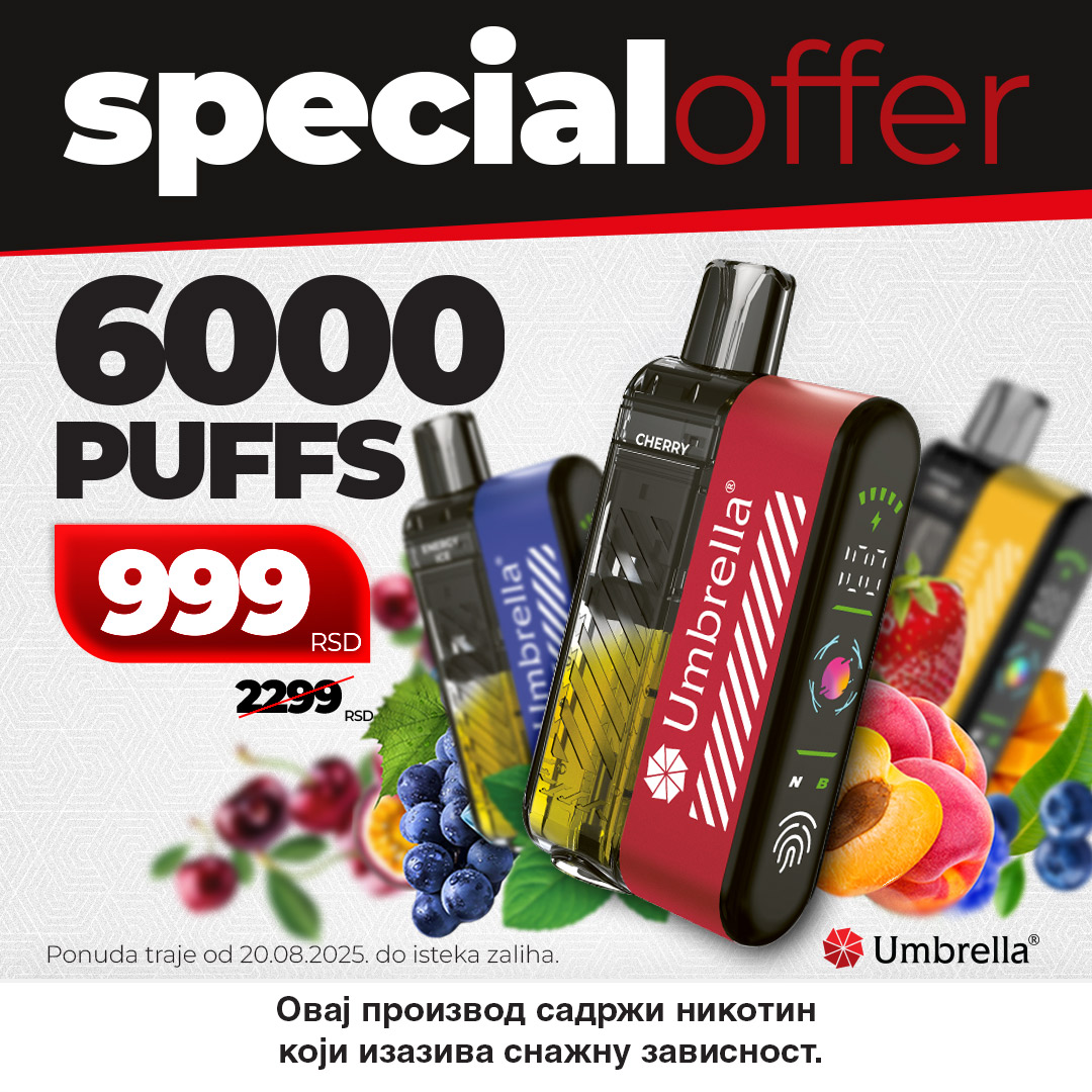Umbrella 6000 puffs set plus sada je dostupan po sniženoj ceni 999 dinara umesto 2.299 rsd u okviru Umbrella shopa.