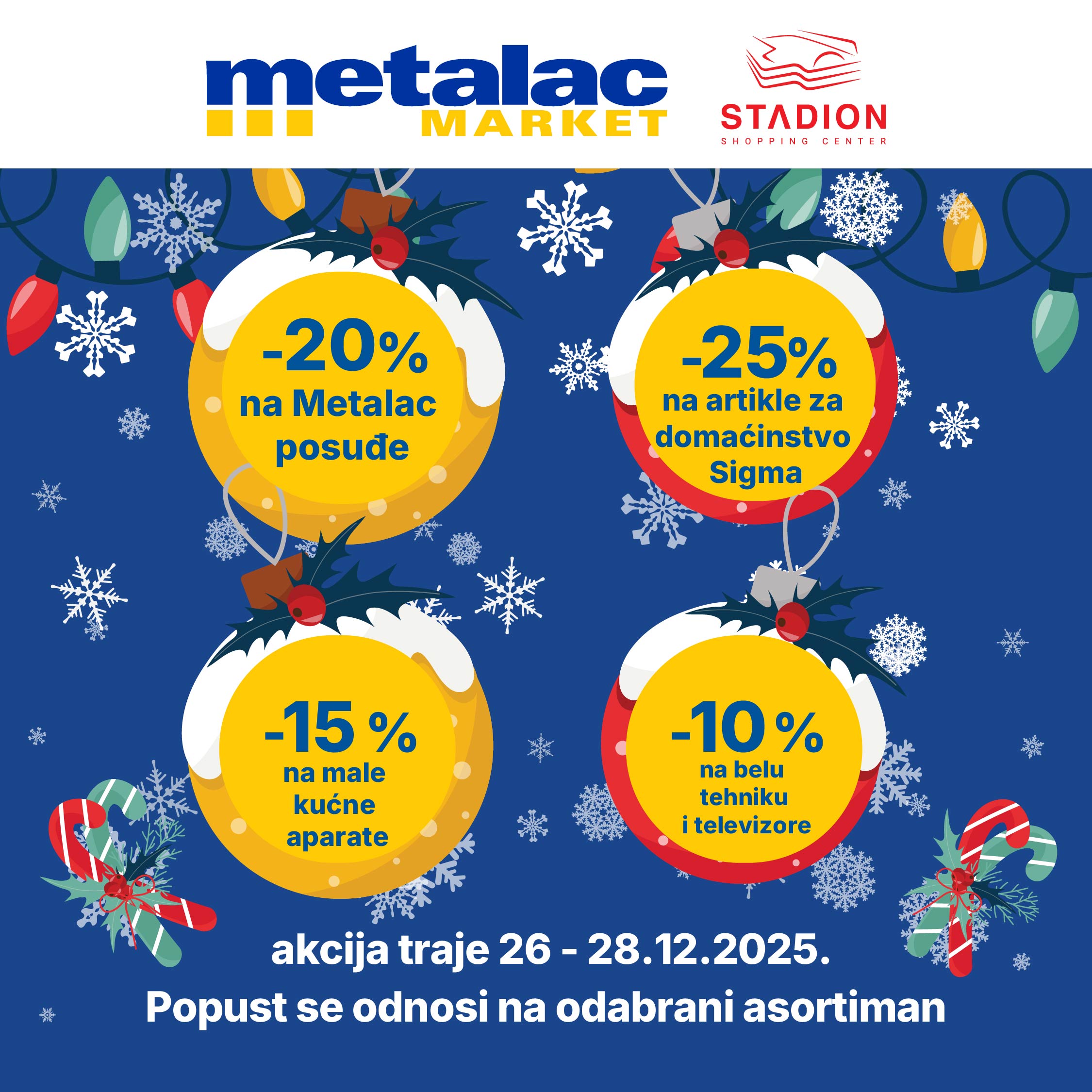 🎉 Metalac Market vas poziva na dane specijalnih popusta u SC Stadion! 👉 Od 26. do 28. decembra očekuju vas snižene cene bele tehnike, televizora, malih kućnih aparata, Metalac posuđa, kao i Sigma asortimana!