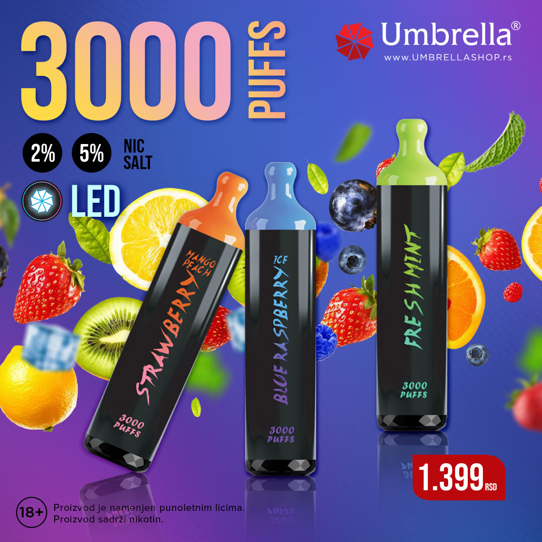 Umbrella 3000 puffs je jednokratni model koji sadrži 8ml tečnosti i to u dve jačine: 2% i 5% NicSalt.