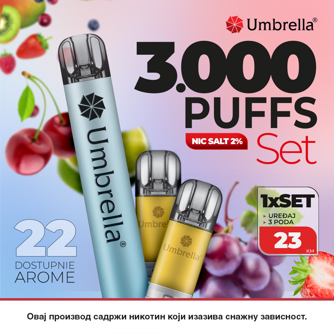 Umbrella 3000 PUFFS SET – je komplet koji se sastoji od uređaja i tri napunjena zamenska POD-a pojedinačnog kapaciteta od 2ml. Ovaj model je dostupan u 23 različite arome.