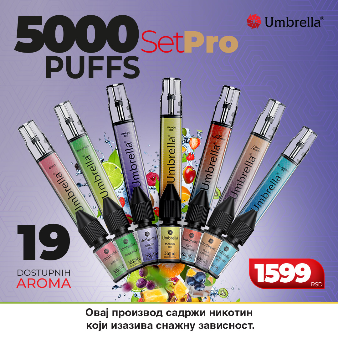 Premium Umbrella elektronska cigareta 5000 PUFFS Set PRO je komplet koji se sastoji od punjivog uređaja i posude (bočice) u kojoj se nalazi 10ml tečnosti.