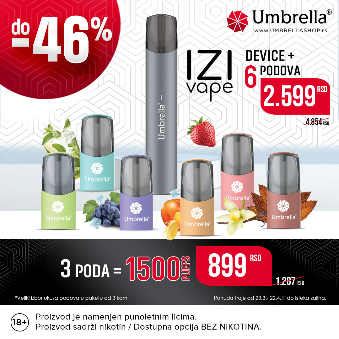 U Umbrella shopu aktuelna je ponuda za IZI vape model i 6 podova, po neverovatnoj ceni od 2.599 rsd.