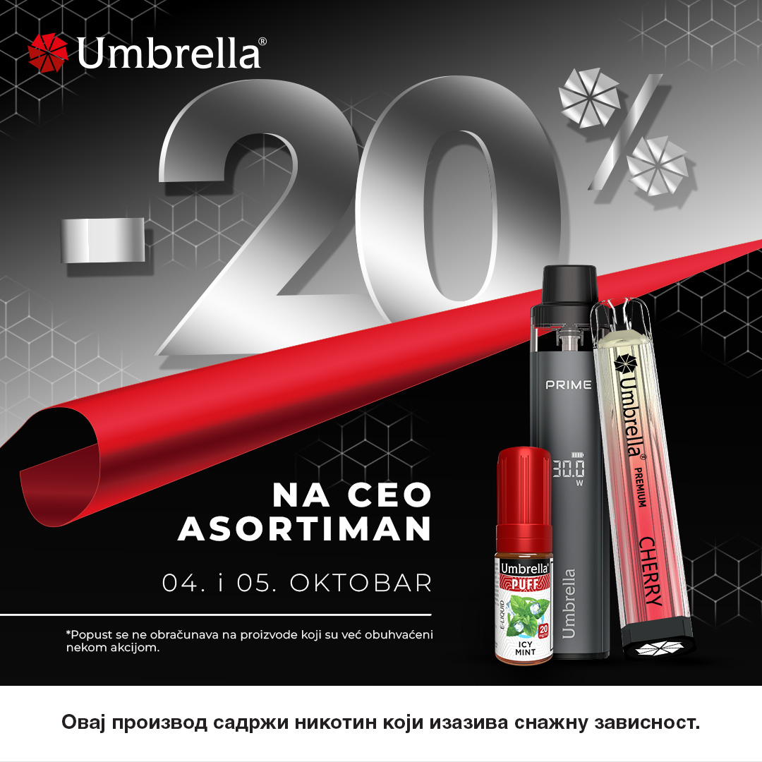 Povodom šoping dana u okviru našeg šoping centra, u Umbrella shopu je akcija na kompletan asortiman proizvoda i to 20%.