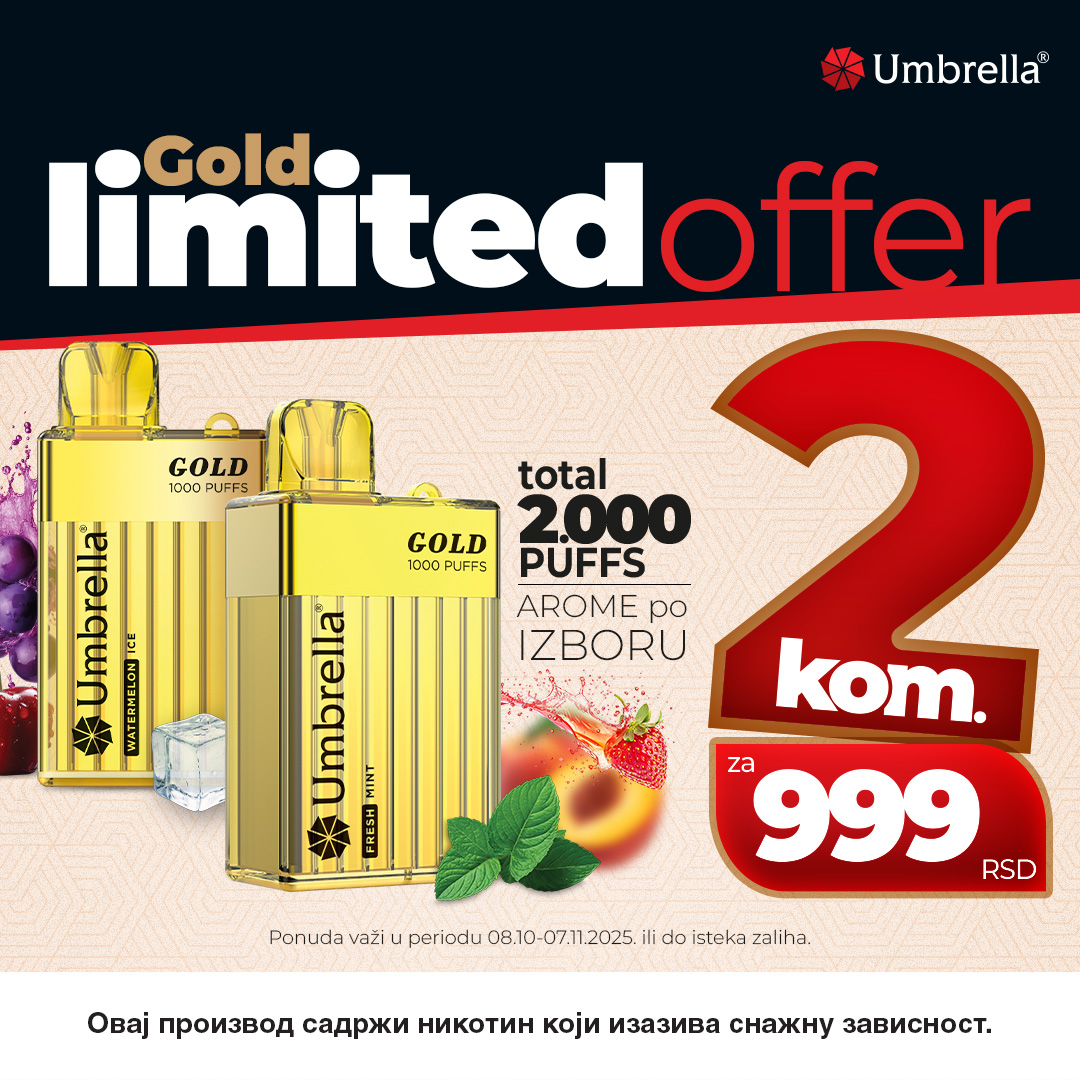 U Umbrella shopu u toku je ponuda koja će trajati do 07.11. – dva jednokratna modela Umbrella 1000 PUFFS GOLD po ceni od 999 rsd.