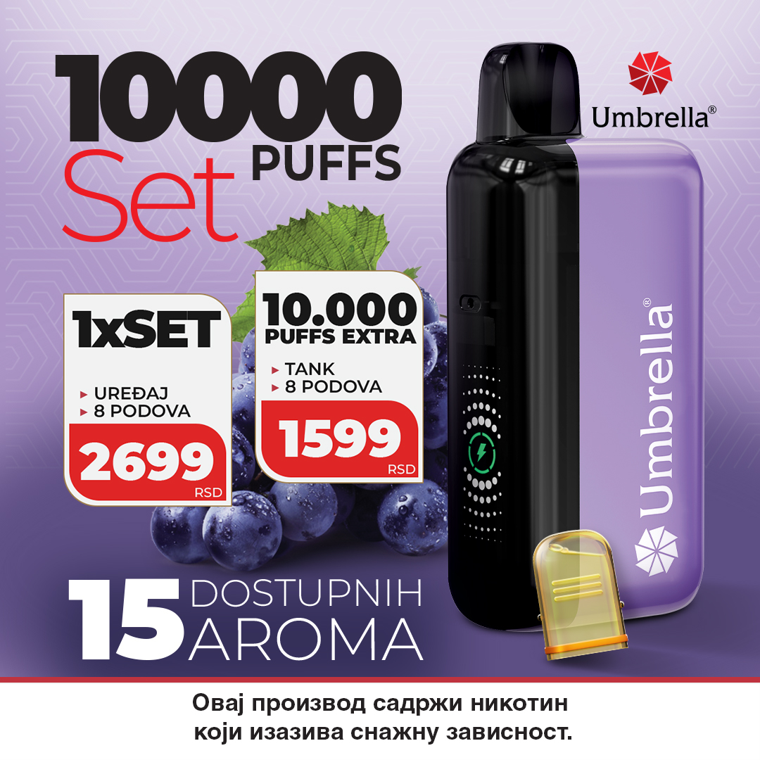 UMBRELLA 10000 PUFFS SET je komplet koji se sastoji od punjivog uređaja, zamenskog tanka sa grejačem i 8 POD-ova kapaciteta po 2ml!