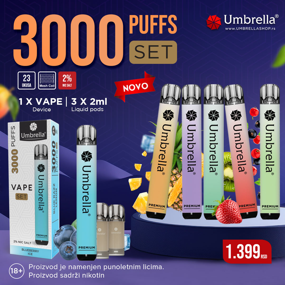 Umbrella 3000 PUFFS SET sastoji se od jednog vejpa i 3 poda napunjena sa 2ml e-tečnosti.