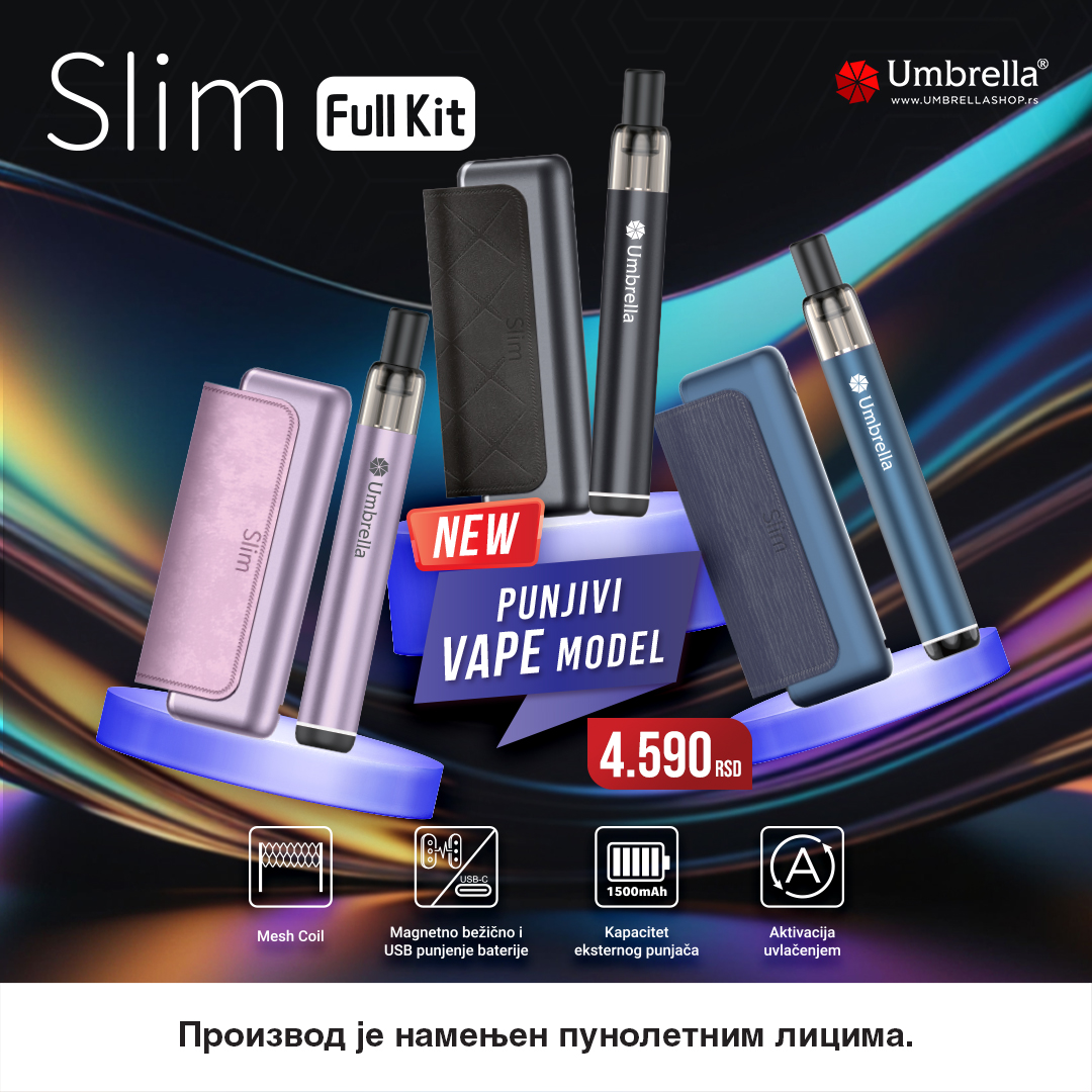 Umbrella Slim – jedinstven model sa eksternim magnetnim punjačem što omogućava da vejp uvek i svuda bude spreman za upotrebu.