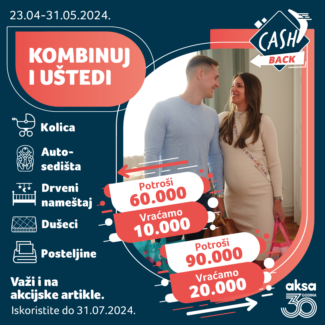 Iskoristite Cash back u Aksi koji važi do 31. maja za kupovinu kolica, auto-sedišta, drvenog nameštaja, dušeka i posteljine. 🧡